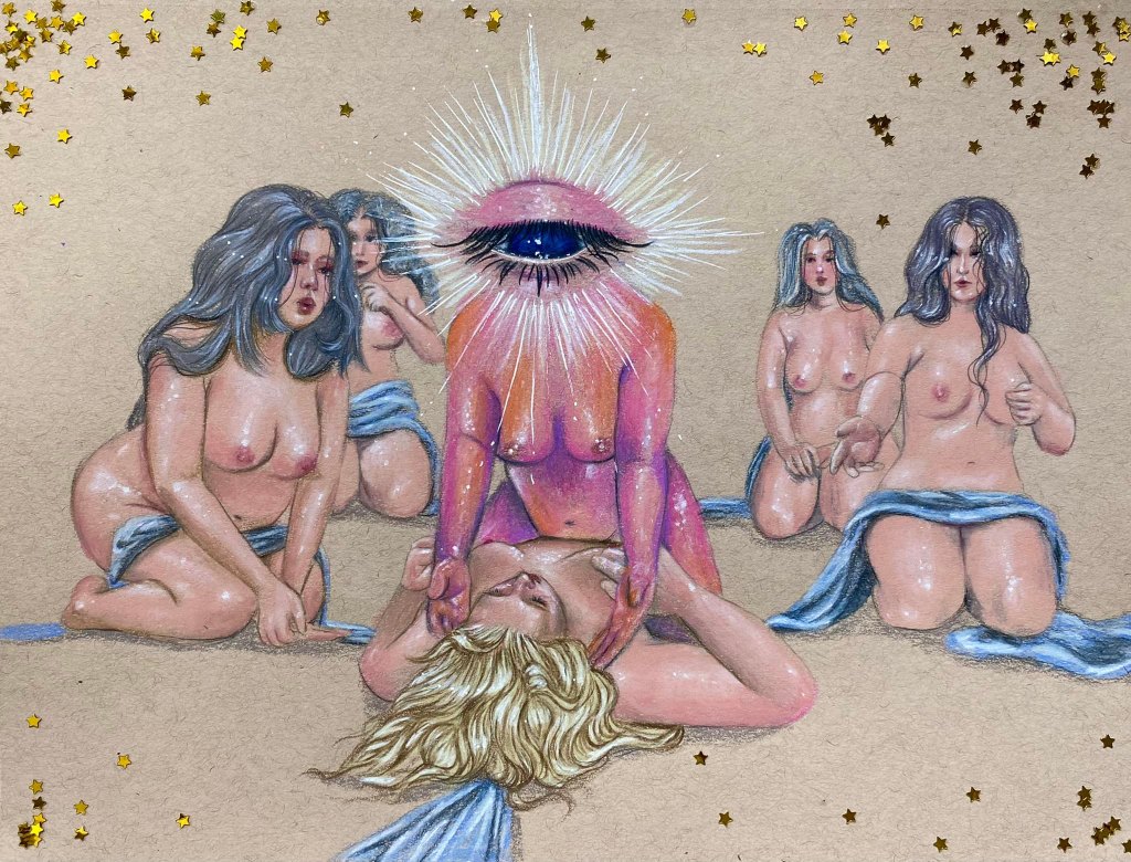 Under the name Abducted Artwork, Shay weaves the mystical with the erotic, the classic with the cosmic. Shay’s art feels like magic – the linework, the symbolism, the way that the figures feel both ancient and reborn. It’s spiritual, sensual, and sometimes explicitly NSFW – and still, it is deeply reverent.